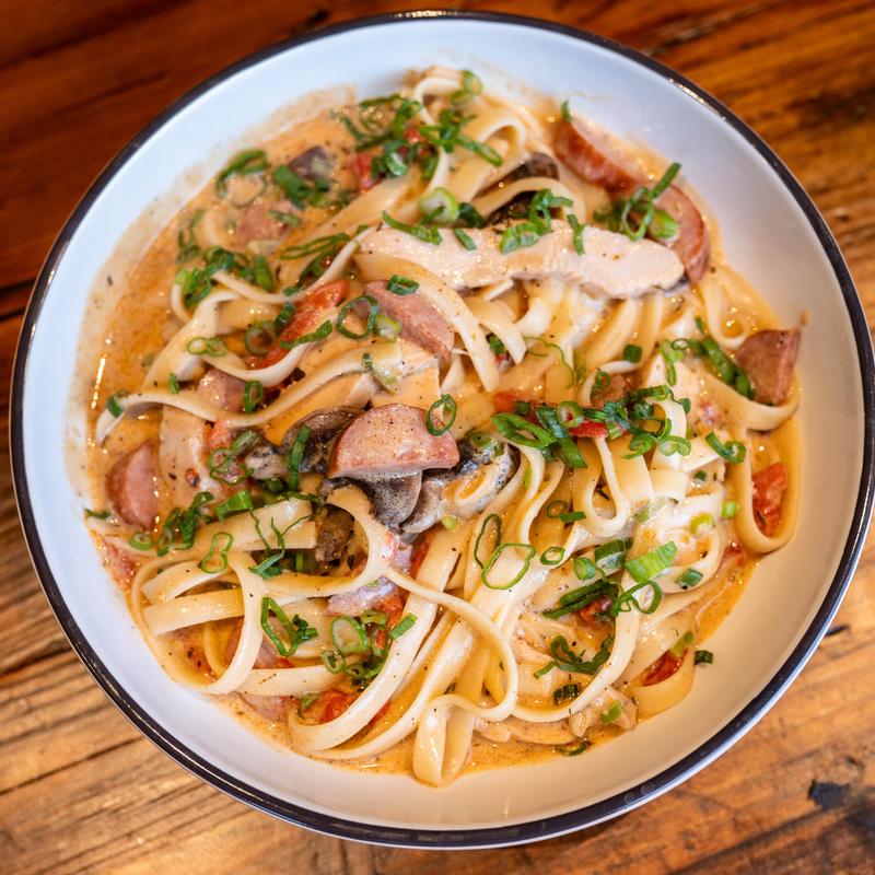 Fettuccine alfredo, cajun chicken, andouille sausage, mushrooms, roasted red pepper, & green onions.