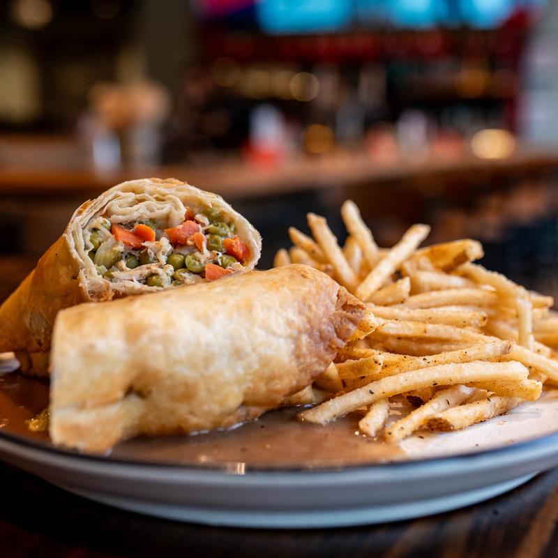 Chicken pot pie in a deep-fried tortilla & chicken gravy with southern fries.