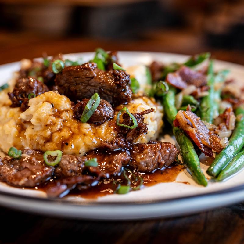 Bourbon-glazed filet tips over creamy cheddar grits with green beans.